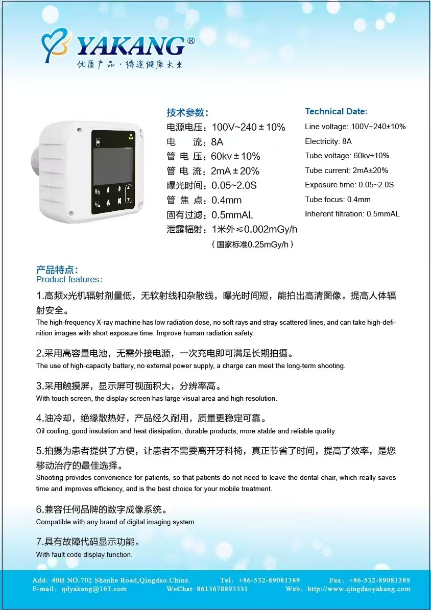1、该设备为直流高频便携式口腔X光机,具有体积小,重量轻,低剂量,效率高等特点
